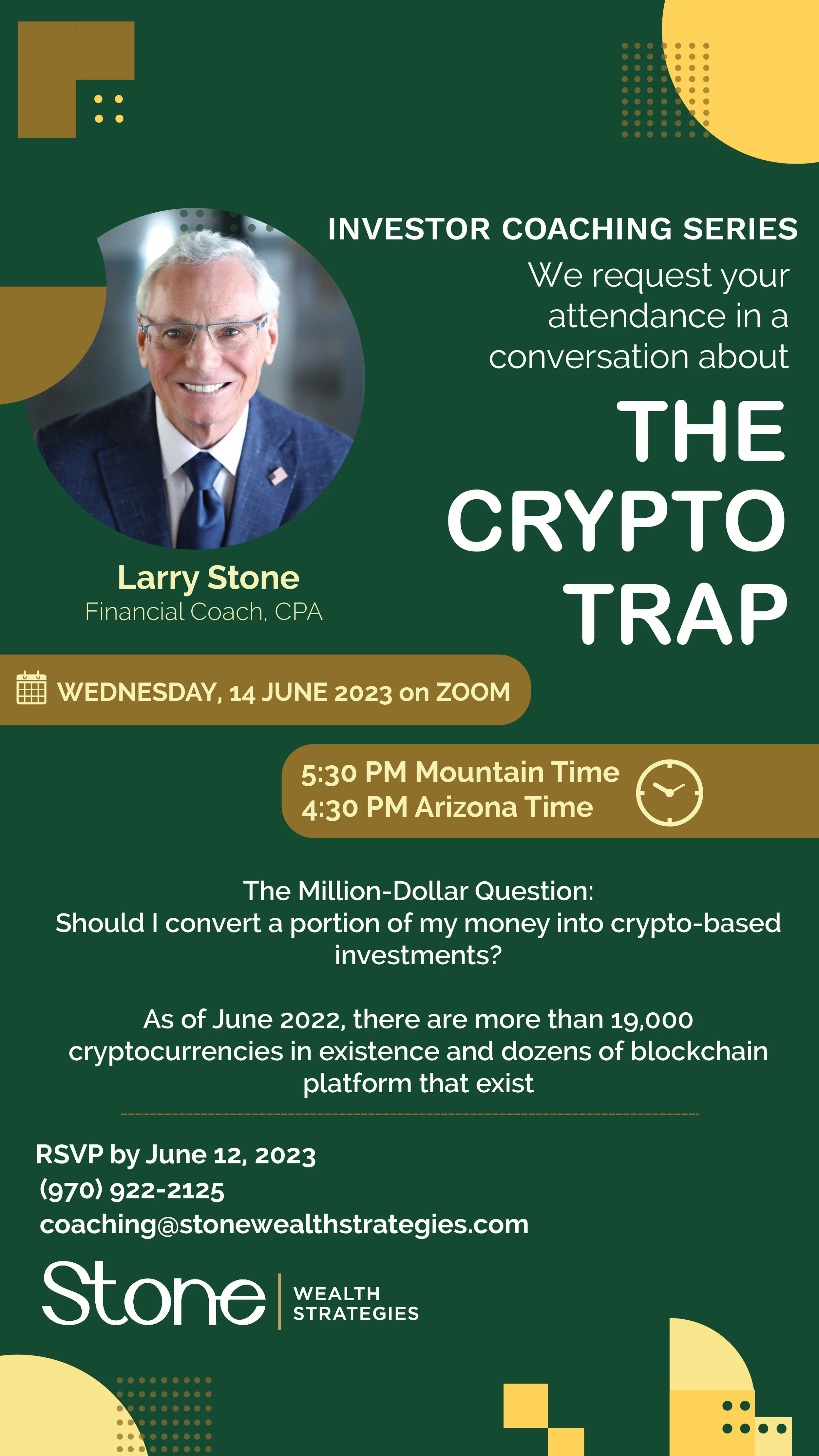 At Stone Wealth Strategies, we believe that education and knowledge will help the investor to understand their investments and create peace of mind around money. We exist to empower you to live your dreams. Our vision is a world where anything is possible. Our mission is to provide life-changing financial coaching for you to achieve freedom and abundance. Within that purpose, we bring to you the conversation called “The Crypto Trap” on Wednesday, June 14, 2023, beginning at 5:30 PM and ending at 7:00 PM mountain time. This is a conversation over Zoom Video Conference.